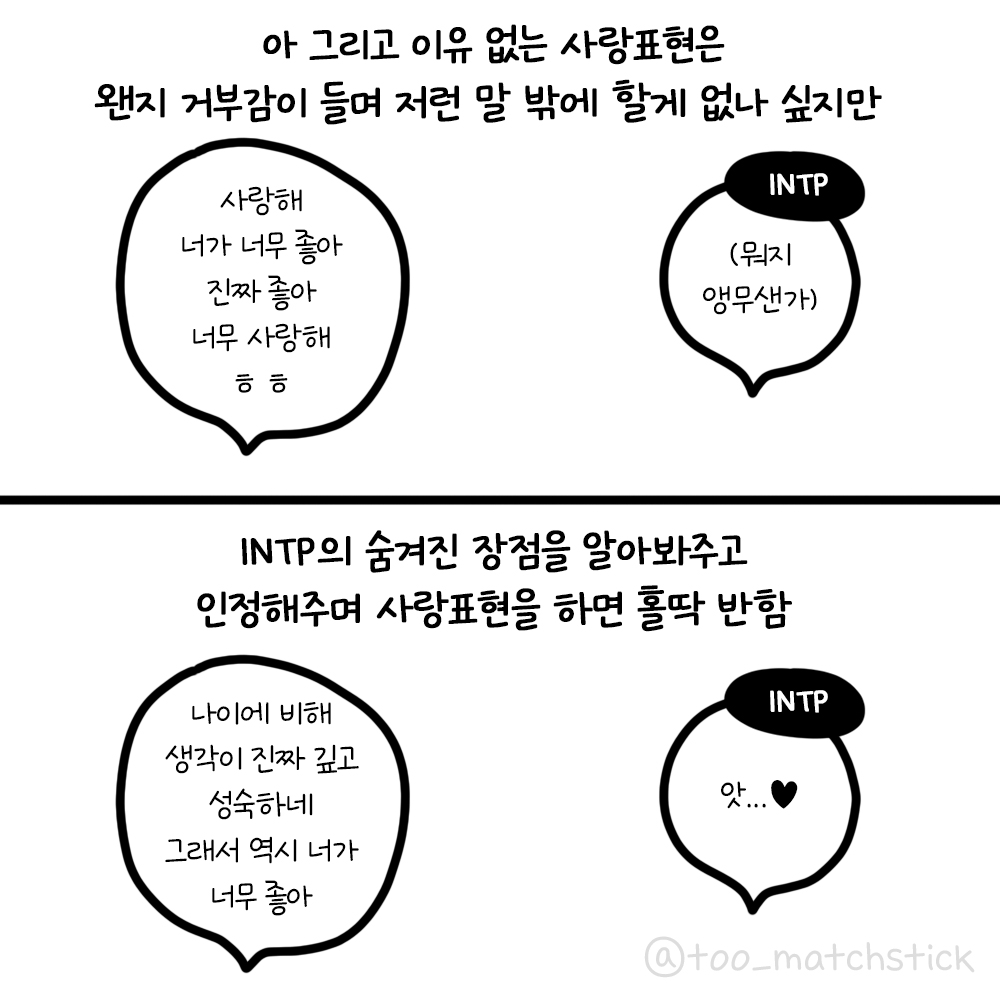 그림 예시에서 첫번째 상황 같은 경우, 진정성이 없다고 느껴집니다. "그냥 당장 외로워서 아무나 만나는 건가..."라는 생각까지 도달할 수 있습니다. 모든 일에는 이유가 있어야 한다고 생각하기 때문인데요. 이는 사랑에도 마찬가지입니다. 반면에 INTP의 숨은 장점을 눈여겨봤다가 그 점을 치켜세우며 칭찬해 주면 INTP은 그 사람을 다시 보게 됩니다. (나를 인정해주는 너의 지능 또한 심상치 않겠구나!🤔)